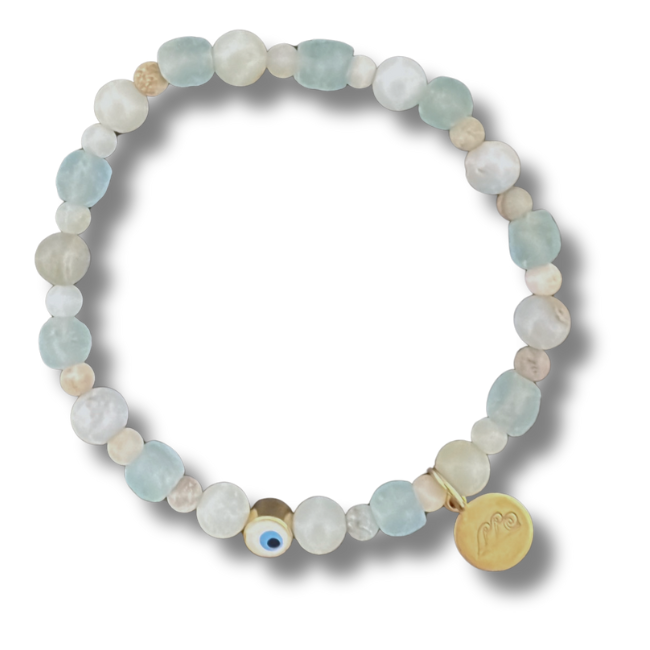 Evil Eye Amulets date back thousands of years and are recognized in many cultures. For protection against the evil eye and bad luck this Evil Eye beaded bracelet is perfect to stack with your other Live by Water bracelets. Handmade with 6 mm Amazonite beads, recycled glass beads and mini amazonite accent beads finished with our Live by Water Make Waves logo charm. It is a stretch bracelet and fits a 7" and 7.5" wrist. It comes in a Live by Water hand stamped jewelry pouch with an enclosure explaining the meaning of the bracelet. Shown below alone and stacked with some of our other handmade bracelets.