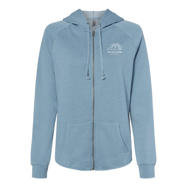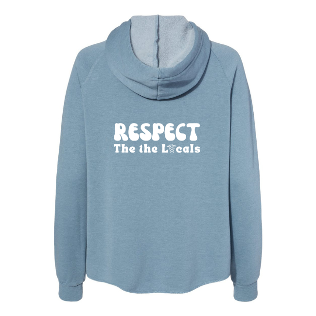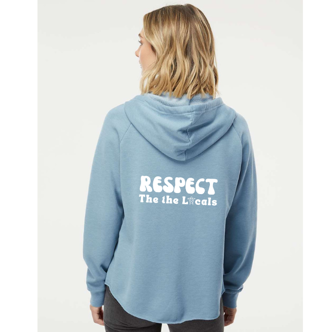 One of our Best Selling Sweatshirts! Wave wash super soft zip-up hoodie with "Respect the Locals" printed on the back and a little Sea Turtle in place of the "O" in Locals. Live by Water make Waves logo on the front. This hoodie has a raw edge hem, comes in 5 colors.